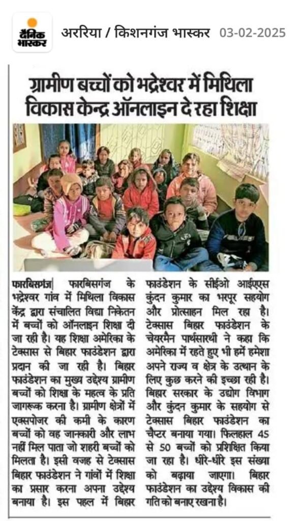Bihar Foundation Texas Chapter has taken the initiative to provide online education to children in rural areas, promoting equal access to learning.